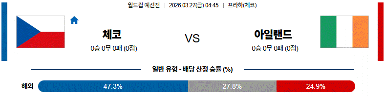 이번 경기는 체코의 피지컬 중심 운영과 아일랜드의 활동량 기반 압박이 맞붙는 구도입니다. 체코는 롱볼과 세트피스를 활용하며 안정적으로 경기를 풀어가려 할 것이고, 아일랜드는 강한 압박과 빠른 전환으로 흐름을 흔들려 할 것입니다.