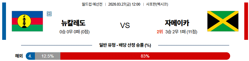 경기 흐름은 자메이카가 점유율과 압박을 바탕으로 우세하게 끌고 갈 가능성이 높으며, 뉴칼레도는 수비 저항은 가능해도 공격 반전 카드가 제한적입니다.