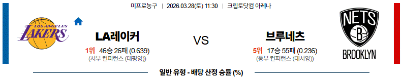 - 핸디캡: LA 레이커스 -8.5 (분할) / 안전 ML