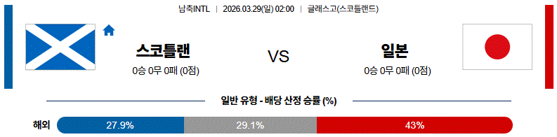 스코틀랜드는 덴마크전 4-2 승리로 1998년 이후 28년 만에 월드컵 본선 진출을 확정지으며 상승 흐름 속에서 평가전에 돌입한다. 최근 7경기에서 5승1무1패를 기록하며 안정적인 경기력을 유지하고 있고 홈에서는 3연승 흐름을 이어가며 글래스고 경기에서 강점을 보이고 있다. 린던 다이크스(FW)는 후반 교체 자원으로 높은 영향력을 보이며 득점 생산에 기여하고 있지만 로렌스 샹클랜드(FW)는 부상으로 이번 명단에서 제외됐다. 최근 몇 년간 전력 상승이 이어지며 유럽 중상위권 경쟁력을 유지하고 있고 유로 2020과 2024 본선 진출을 통해 안정적인 전력을 구축했다. 전술적으로는 강한 압박과 활동량을 기반으로 측면 활용과 크로스 비중이 높은 공격 구조를 갖고 있으며 수비 라인은 조직적으로 움직이며 중원 압박 강도가 높은 팀이다.