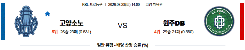 고양 소노는 최근 10연승 흐름 속에서 이정현의 경기 조율과 나이트 켐바오의 득점력이 안정적으로 이어지며 공격과 조직력 모두 완성도를 끌어올린 모습이고 후반기 18경기 15승3패로 흐름 자체가 리그 최상위 수준이다. 또한, 벤치 자원들의 기여까지 살아나며 경기 후반 집중력에서도 흔들림이 없는 모습이다. 반면, 원주 DB는 알바노와 엘런슨 중심으로 공격은 유지되고 있지만 턴오버 관리 문제와 4쿼터 뒷심 부족이 반복되며 접전에서 흐름을 내주는 장면이 이어지고 있다. 상대전에서도 소노가 흐름을 잡고 있는 만큼 전체적인 경기 양상은 고양 소노가 주도할 가능성이 높다. 고양 소노의 승리가 예상된다.