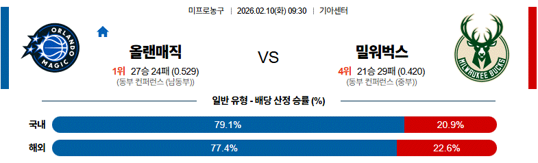 올랜도 매직의 승리를 예상합니다. 밀워키는 공수의 핵인 야니스 아데토쿤보가 부상으로 이탈한 상황에서 올랜도의 탄탄한 포워드 라인을 제어할 수단이 마땅치 않습니다. 올랜도는 파올로 반케로를 중심으로 웬델 카터 주니어와 데스먼드 베인이 공수에서 조화를 이루고 있으며, 특히 홈에서의 견고한 수비 리바운드 장악력은 밀워키의 세컨드 찬스를 철저히 봉쇄할 것입니다. 밀워키는 릴라드와 쿠즈마의 외곽포에 의존하겠지만, 올랜도의 시스템 수비 조직력은 단조로운 밀워키의 공격 패턴을 무력화하기에 충분합니다. 골밑 지배력의 차이가 승부의 향방을 가를 것이며, 올랜도의 수비 집중력을 고려할 때 저득점 양상의 언더가 유력합니다.