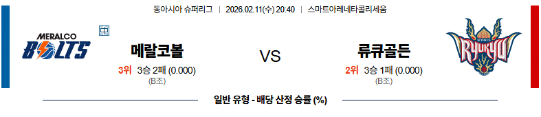스마트 아레네타 콜리세움(필리핀)에서 펼쳐지는 경기다. 메랄코는 론데 홀리스제퍼슨(F)의 시즌 아웃과 주장 크리스 뉴섬(SG)의 출전 불확실성이 전력에 큰 부담이다. 여기에 파이널 진출을 위해 6점 차 이상 승리가 필요해 경기 운영이 조급해질 가능성이 크다. 반면 류큐 골든 킹즈는 기존 코어 전력을 유지하며 안정적인 흐름을 이어가고 있고, 잭 쿨리(PF)와 알렉스 커크(C)의 골밑 장악력도 우위다. 전체적인 완성도와 심리적 여유를 고려하면 류큐 골든 킹즈의 승리가 예상된다.
