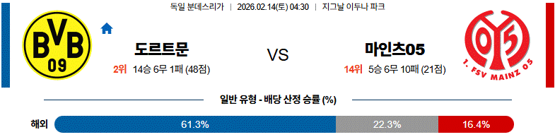 전체적으로 도르트문의 공세가 길어질 흐름이며, 마인츠가 얼마나 수비 집중력을 유지하느냐가 관건입니다.