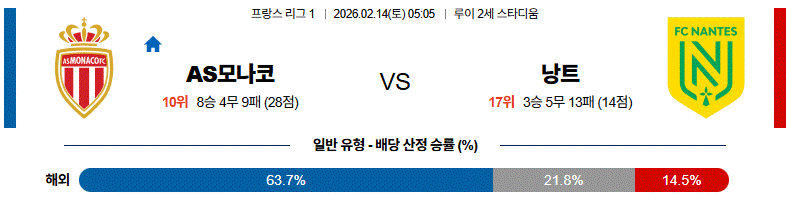 전체 흐름은 모나코의 공세가 길어질 가능성이 높고, 낭트가 얼마나 버티며 역습 찬스를 살리느냐가 핵심입니다.