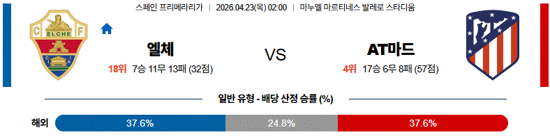 엘체가 홈에서 쉽게 무너지지 않겠지만, 전체적인 전술 완성도와 경기 관리 능력에서는 AT마드리드가 한 단계 앞서는 흐름입니다.