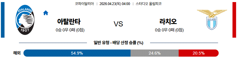 라치오가 수비적으로 버티며 역습을 노릴 수는 있지만, 경기 전체 템포와 찬스 생산력에서는 아탈란타가 조금 더 앞서는 흐름을 만들 가능성이 있습니다.
