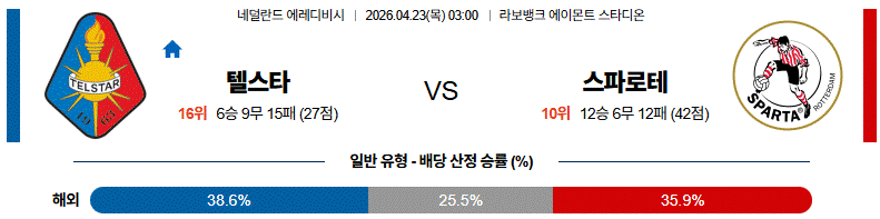 텔스타 vs 스파르타 경기는 전력과 경기 운영 완성도에서 스파르타가 조금 더 앞서는 에레디비시 매치입니다.