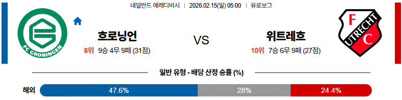 전체적으로 위트레흐가 흐름을 주도하되, 흐로닝언의 역습이 변수로 작용할 수 있는 경기입니다.