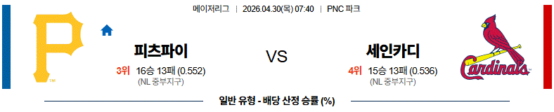 세인트루이스 카디널스는 안드레 팔란테(2승 2패 4.26)가 시즌 3승에 도전한다. 25일 시애틀과 홈 경기에서 5.1이닝 4안타 3실점의 투구로 패배를 당한 팔란테는 낮 경기 문제가 크게 터지는 중이다. 반면 야간 경기에선 피안타율 .176으로 대단히 강력한 투구를 과시하고 있는데 10.3%의 배럴 비율과 43.6%의 하드 히트 비율은 일단 낮 경기 한정일 가능성이 있다. 전날 경기에서 애쉬크래프트와 바르코를 공략하면서 홈런 2발 포함 무려 11점을 올린 세인트루이스의 타선은 강속구 공략 문제를 어느 정도 벗어낫다는 점이 긍정적인 부분이다. 득점권의 집중력도 훌륭한 편. 3.2이닝동안 4실점을 허용한 불펜은 옥석 가리기가 한창이다.