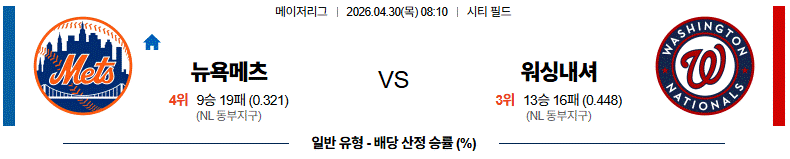 전날 경기에서 메츠는 기분 좋게 리텔을 공략하는데 성공했다. 이 흐름이라면 캐벌리 상대로도 해볼만 하겠지만 캐벌리의 전날 불펜 상대 부진, 그리고 캐벌리의 타구 허용 타입을 고려한다면 좋은 흐름이 깨질 가능성도 높은 편. 게다가 피터슨의 금년 투구는 솔직히 좋다고 할수 없고 워싱턴은 좌완에게 매우 강한 팀이라는걸 잊어선 안된다. 워싱턴의 승리가 유력하다.