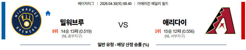다시금 밀워키의 화력이 타오르기 시작했다. 그러나 좌완에게 고전하는 팀 특성상 로드리게즈 상대로 고전 가능성이 높은 편. 하지만 지금의 애리조나 역시 화력 좋다는 말은 절대로 할수 없는 레벨이다. 멕시코 시티 후유증은 이번 경기까지 이어질 가능성이 매우 높은 편. 결국 불펜 싸움인데 솔직히 지금 상황에서 불펜 대결로 간다면 유리함을 잡을수 있는건 홈팀이다. 밀워키의 승리 가능성이 조금 더 높아 보인다.