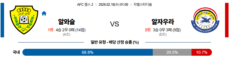 전체적으로는 알와슬이 점유율 기반으로 안정적인 전개를 시도하는 가운데, 알자우라의 역습이 주요 변수가 될 양상이 예상됩니다.