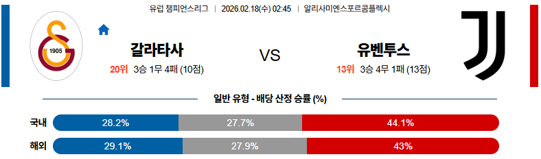 갈라타사는 홈에서 강하게 몰아붙이겠지만, 유벤투스의 수비 조직력과 역습 대응이 만만치 않습니다.