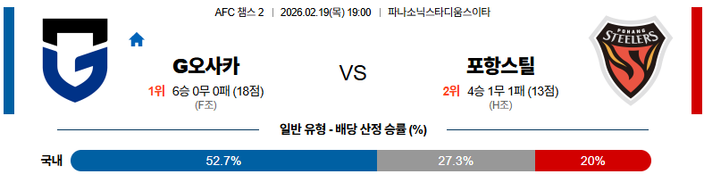 G오사카는 점유율과 공격 전개에서 우위를 점하겠지만, 포항스틸의 수비 조직력과 역습이 만만치 않습니다.
