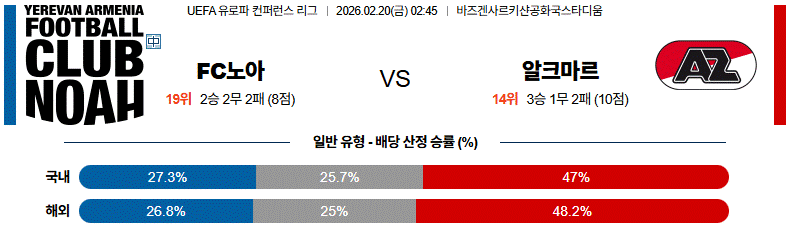 FC노아는 수비 중심의 전개로 흐름을 관리하며 기회를 찾겠지만, 알크마르의 빠른 전방 압박과 공간 침투가 경기 흐름을 좌우할 가능성이 큽니다.