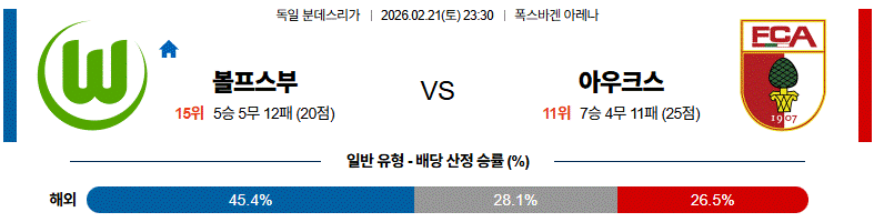 볼프스부는 점유율 기반으로 경기를 풀어가겠지만, 아우크스의 역습과 전방 압박이 변수를 만들어 흐름을 바꿀 수 있습니다.