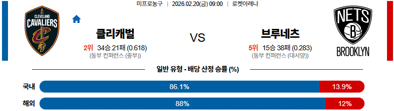 다음날 원정에서 샬럿을 만나는 클리블랜드와 다음날 원정에서 워싱턴을 만나는 일정을 위해서 힘을 분산해야 하는 브루클린의 만남 이다. 클리블랜드는 최근 연승 흐름과 함께 공격과 수비 균형이 안정된 모습을 보이고 있으며 홈에서도 강한 경기력을 유지하고 있다. 미첼과 앨런을 중심으로 득점 루트가 다양하고 하든의 경기 조율 능력도 안정감을 더하고 있다. 메릴의 외곽 생산력까지 살아나며 팀 공격력이 상승세를 보이고 있다. 다만, 일부 부상 변수는 있지만 전반적인 전력 완성도는 유지되는 상황이다. 반면, 브루클린은 후반 집중력 부족과 턴오버 문제가 반복되고 있으며 원정에서도 부진한 흐름이 이어지고 있다. 핵심 득점 자원의 결장 가능성도 부담이다. 클리블랜드 승리가 예상되는 경기. 다만, 핸디캡 범위는 과하다고 생각된다.