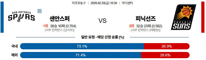 무디센터(텍사스) 중립구장에서 펼쳐지는 경기다. 샌안토니오는 최근 6연승과 함께 공격과 수비 모두 안정된 흐름을 이어가고 있으며 웸반야마와 폭스를 중심으로 득점 생산력이 크게 상승한 모습이다. 빠른 템포와 외곽, 골밑을 모두 활용하는 공격 패턴이 안정적으로 유지되고 있고 홈과 유사한 경기력으로 중립 경기에서도 경쟁력이 높다. 다만, 상대전 열세는 변수지만 현재 상승세는 뚜렷하다. 반면, 피닉스는 최근 승리 흐름에도 수비 집중력 기복이 이어지고 있으며 핵심 자원 관리 변수로 경기력 안정감이 떨어질 가능성이 있다. 공격력은 유지되지만 실점이 많아 난타전 양상이 예상된다. 샌안토니오 우세와 오버가 예상된다.
