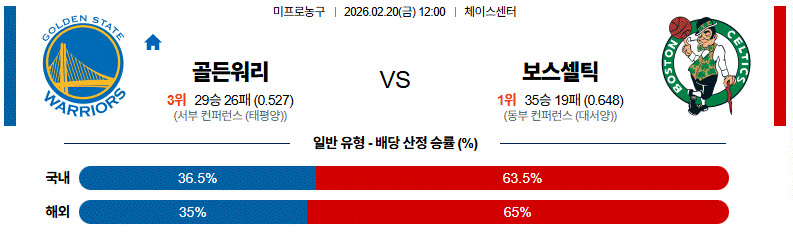 골든스테이트는 최근 공격과 수비 모두 기복이 이어지고 있으며 커리의 결장 공백 속에서 경기 후반 집중력 저하가 반복되고 있다. 올스타전에 결장했던 스테판 커리의 출전 여부가 당일 결정이지만 정상 컨디션이 아닌 점도 부담이다. 또한 버틀러 시즌 아웃으로 전력 안정감이 떨어지고 있다. 홈 성적은 나쁘지 않지만 현재 전력 완성도는 낮아진 모습이다. 반면, 보스턴은 브라운과 프리처드를 중심으로 공격 밸런스를 유지하고 있고 원정에서도 안정적인 경기력을 이어가고 있다. 수비 조직력과 골밑 경쟁력에서도 우위를 보인다. 보스턴 승리가 예상된다.