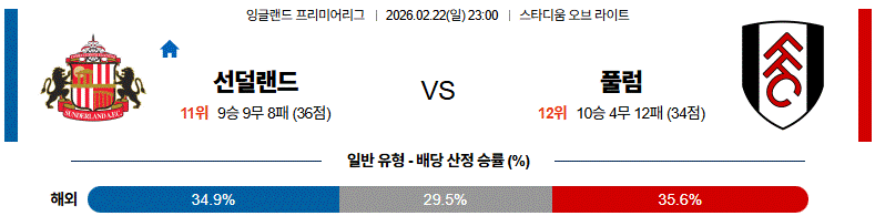 선덜랜드는 압박과 역습으로 흐름을 만들겠지만, 풀럼은 점유율과 빌드업 완성도가 전체 전력에서 우위를 점할 가능성이 큽니다.