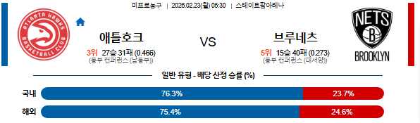 애틀란타는 연속경기 일정이였던 직전경기(2/21) 홈에서 마이애미 상대로 97-128 패배를 기록했으며 이전경기(2/20) 원정에서 필라델피아 상대로 117-107 승리를 기록했다. 최근 5경기 1승4패 흐름 속에 리바운드 46-58, 3점슛 16-13, 턴오버 12-8의 결과. 제일런 존슨(16득점, 16리바운드, 11어시스트)이 트리플더블을 기록했고. 오네카 오콩우(22득점),CJ 맥컬럼(20득점)이 분전했지만 나머지 선수들의 지원이 부족했던 경기. 수비 집중력과 조직력이 무너지며 초반부터 흐름을 내줬고 경기 전반에서 격차를 줄이지 못했던 상황. 정규시즌 홈경기에서는 2연패 흐름속에 10승16패 성적.